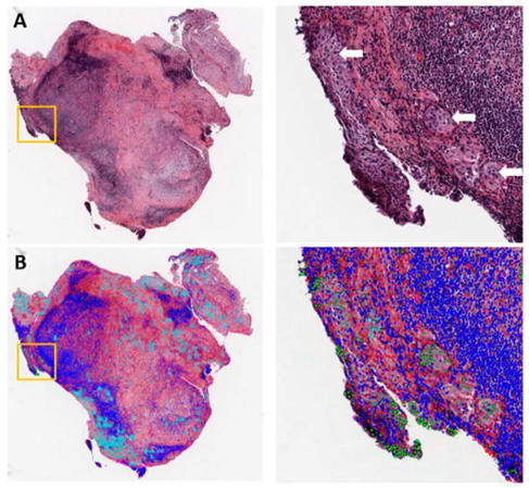 Figure 1: Example of metastasis detection in the lymph node for a lung adenocarcinoma patient. (A) Hematoxylin and eosin (H&E)-stained lymph node pathology slide. Tumor cells began to invade into the capsule in the orange box, with white arrows pointing to tumor cells. (B) Cell classification result overlaid on the H&E image. Green: Tumor nuclei; blue: Lymphocytes; red: Stroma nuclei; cyan: Necrosis. Adapted from Cancers 2019, 11(11), 1673.