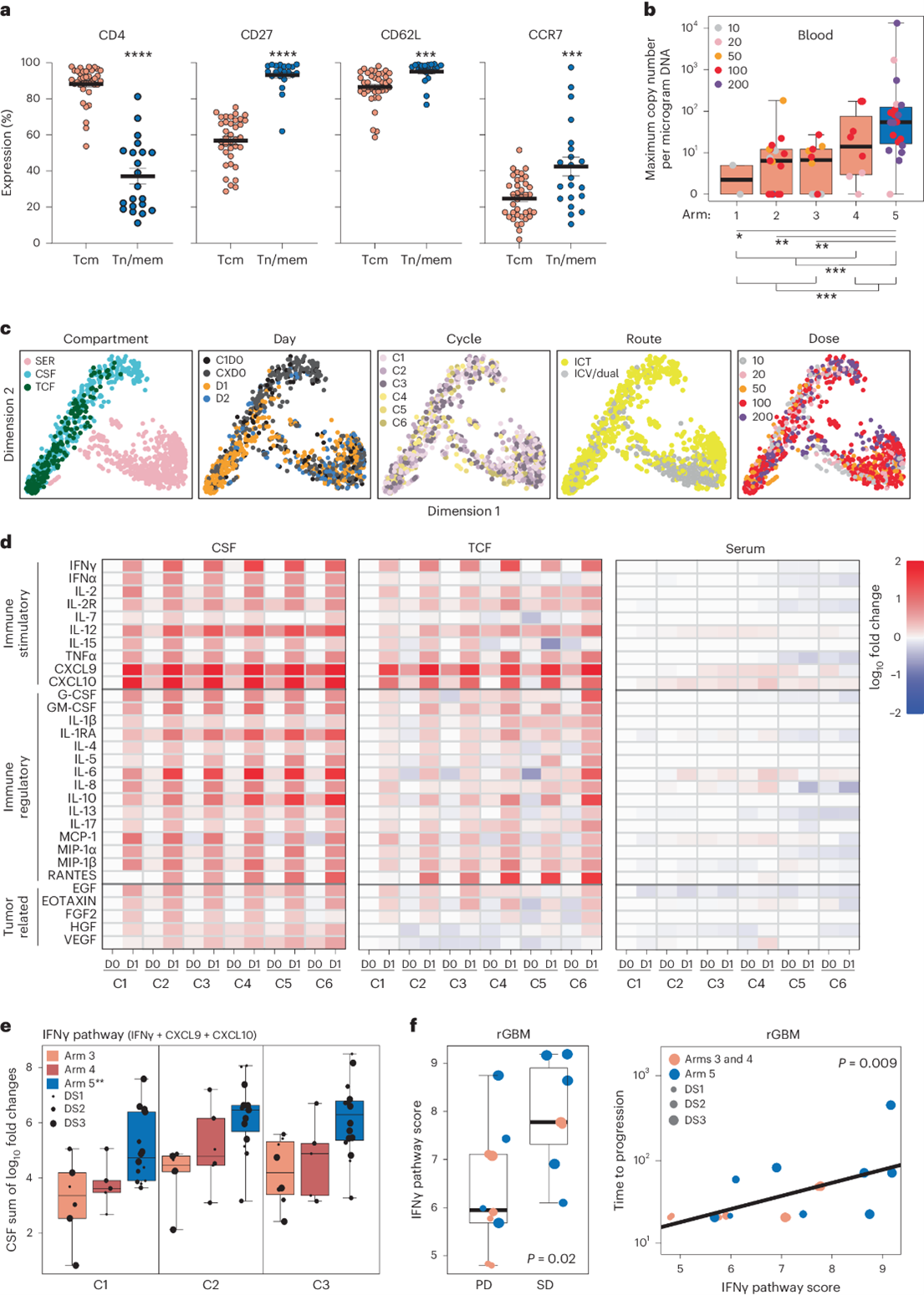 Fig 1:  a Expression of CD4, CD27, CD62L, and CCR7 on Tcm- and Tn/mem-derived CAR+ T cells, shown with means and standard error. Significant differences indicated by P-values (****P < 0.0001; ***P ≤ 0.0005). b WPRE copy number per microgram of PBMC DNA shown in a box-and-whisker plot, with significant differences between treatment arms (P ≤ 0.0003).c Cytokine measurements represented by low-dimensional plots, coloured by sample compartment (CSF, TCF, or serum), treatment day, and dose. d Heatmap of cytokine levels across cycles and days (pre- and post-infusion), showing log10 fold changes from baseline in CSF, TCF, and serum. e IFNγ pathway score changes shown in a box-and-whisker plot for patients in arms 3, 4, and 5, with significant differences (P ≤ 0.0006) between arms. f CSF IFNγ pathway score plotted against response and time to progression, highlighting correlation with better outcomes. Significant differences indicated by P-values. Adapted from: Brown, C.E., Hibbard, J.C., Alizadeh, D. et al. Locoregional delivery of IL-13Rα2-targeting CAR-T cells in recurrent high-grade glioma: a phase 1 trial. Nat Med 30, 1001–1012 (2024). https://doi.org/10.1038/s41591-024-02875-1